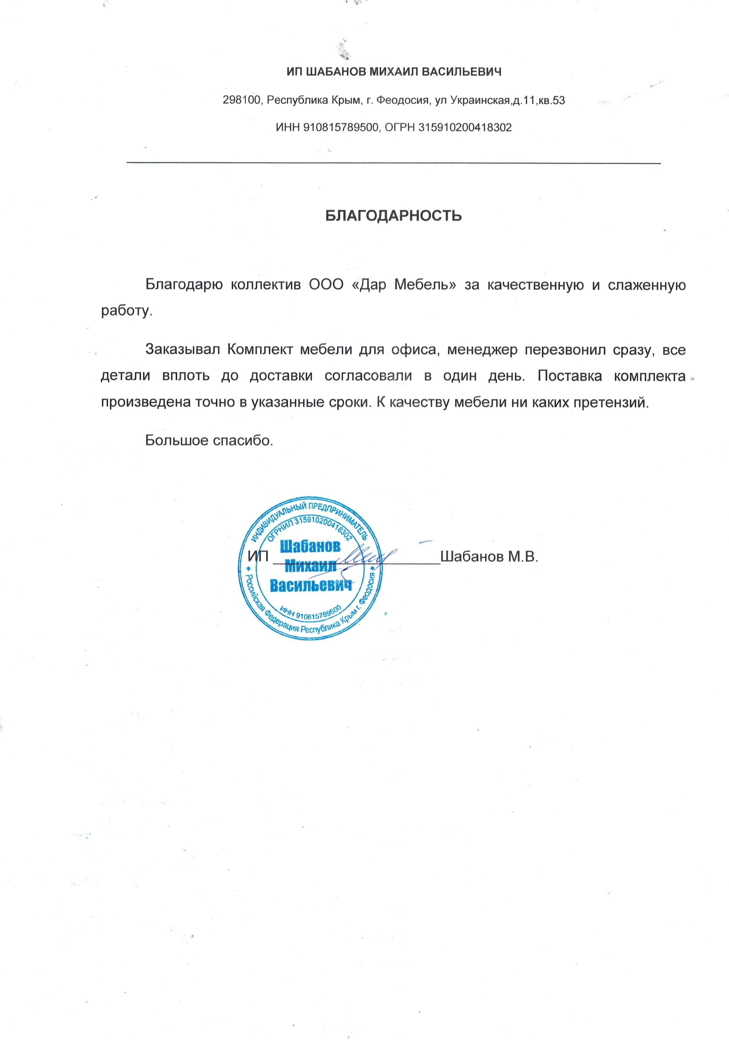 Уважаемый коллектив компании ДАР-МЕБЕЛЬ! Выражаем Вам нашу искреннюю благодарность и глубокую признательность за плодотворное сотрудничество! Отзыв можете проверить как вам удобно! Отправил запросы во все компании в выдаче яндексе на первой странице. Из 10 компаний сразу ответили только 3 компании. Из этих трёх компаний позвонили сразу только Дар-Мебель. Сборщик Дар-Мебели уже собирает у меня стол ресепшен, а остальные семь компаний ещё присылают свои КП. Сроки заявленные, больше чем фактические. Качество работы с клиентами 5+ Соотношение цена и качество 5+ Оперативность доставки 5+ Сборка 5+ В то время пока мне другие компании на блокноте и на бумажках присылали карандашом эскизы того, что мне нужно, Дар-Мебедь подготовили интеллигентное коммерческое предложение, которое не то, чтобы на один стол не стыдно смотреть или показать, а на оптовый заказ смело. Всё понравилось. Первый раз встречаю такую компанию. Очень жаль, что коллеги-конкуренты совсем наплевательски относятся к клиентам - руководство даже не может купить себе П.О. для того, чтобы не текстом писать варианты размеров и габаритов - а через спец.приложение вводить размеры кабинета, стола, мебели - и всё автоматически рисовалось, чтобы далее предоставлять клиентам подробнейший чертёж и 3D модель. Кризис? Киентов нет? Нет, не слышал! Вот он Я! Клиент! На все 10 компаний на первой странице Яндекса, только Дар-Мебель квалифицированно, позитивно, доброжелательно и оперативно обработали наш простейший запрос на стол для секретаря!