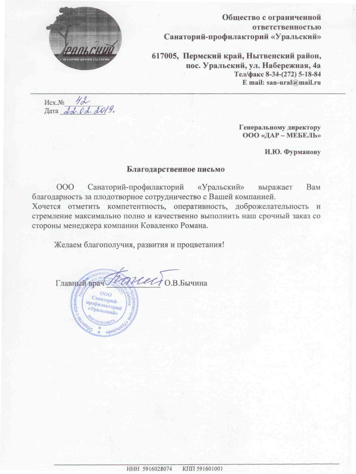 ООО Санаторий-профилакторий «Уральский» выражает Вам благодарность за плодотворное сотрудничество с Вашей компанией. Хочется отметить компетентность, оперативность, доброжелательность и стремление максимально и качественно выполнить наш срочный заказ со стороны менеджера компании Коваленко Романа. Желаем благополучия, развития и процветания!