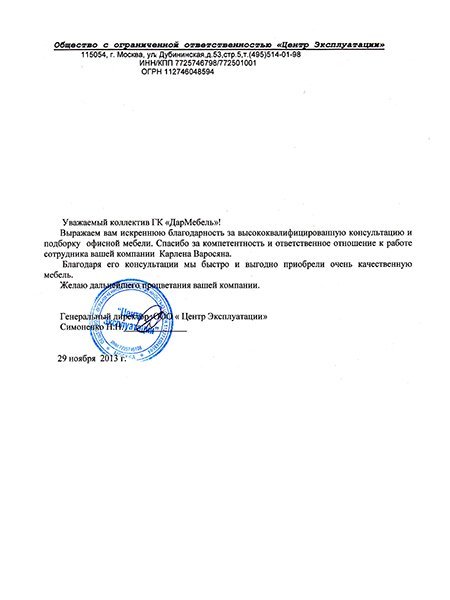 Уважаемое руководство и коллектив ГК "ДАР МЕБЕЛЬ" Выражаем Вам самую искреннюю благодарность и за высококвалифицированные услуги по подбору, доставке и сборке офисной мебели. Хочется отметить компетентность и ответственное отношение к работе Вашей компании Журавлева Александра Юрьевича . Благодаря его консультациям мы смогли быстро и по выгодной цене приобрести очень качественную мебель. Так же выражаем благодарность отделу логистики за оперативную поставку и качественную сборку офисной мебели. Надеемся на дальнейшее плодотворное сотрудничество. Желаем успехов и процветания Вашей компании.
