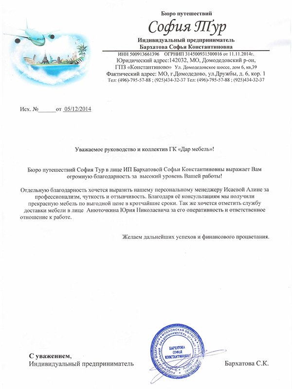 Бюро путешествий София Тур в лице ИП Бархатовой Софьи Константиновны выражает Вам огромную благодарность за высокий уровень Вашей работы! Отдельную благодарность хочется выразить нашему персональному менеджеру Исаевой Алине за профессионализм, чуткость и отзывчивостью. Благодаря её консультациям мы получили прекрасную мебель по выгодной цене в кротчайшие сроки. Так же хочется отметить службу доставки мебели в лице Анюточкина Юрия Николаевича за его оперативность и ответственное отношение к работе. Желаем дальнейших успехов и финансового процветания.