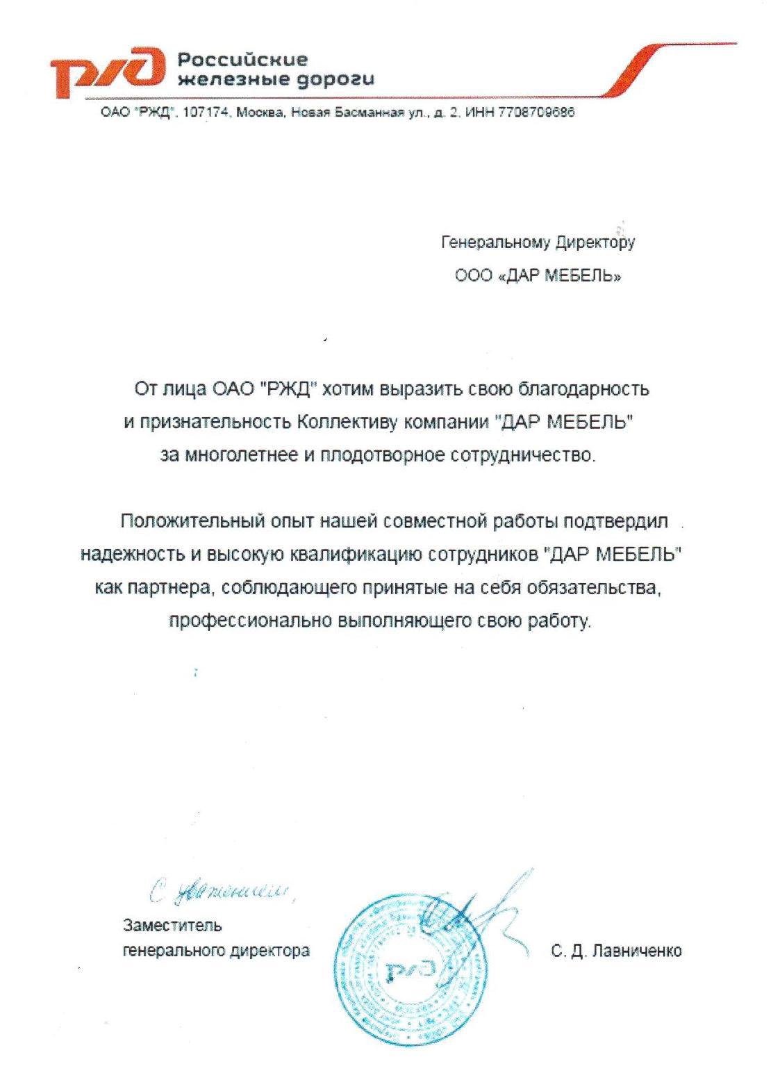 От лица ОАО "РЖД" хотим выразить свою благодарность и признательность Коллективу компании "ДАР-МЕБЕЛЬ" за многолетнее и плодотворное сотрудничество. Положительный опыт нашей совместной работы подтвердил надежность и высокую квалификацию сотрудников "ДАР-МЕБЕЛЬ"" как партнера, соблюдающего принятые на себя обязательства, профессионально выполняющего свою работу. www.rzd.ru