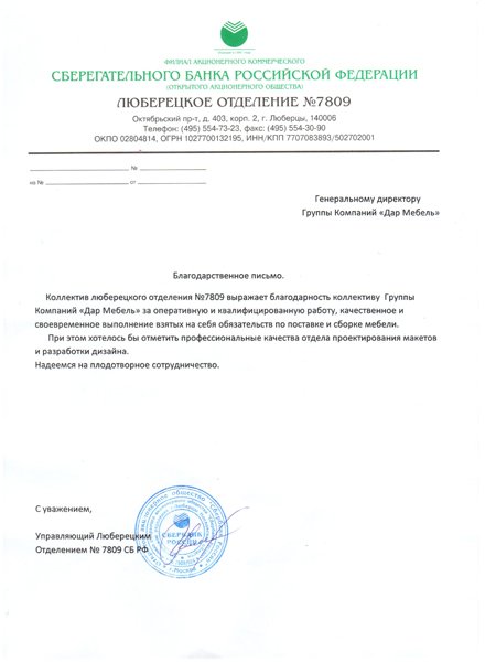 Коллектив люберецкого отделения №7809 выражает благодарность коллективу Группы Компаний "Дар Мебель" за оперативную и квалифицированную работу, качественное и своевременное выполнение взятых на себя обязательств по поставке и сборке мебели. При этом хотелось бы отметить профессиональные качества отдела проектирования макетов и разработки дизайна. Надеемся на плодотворное сотрудничество. www.sberbank.ru