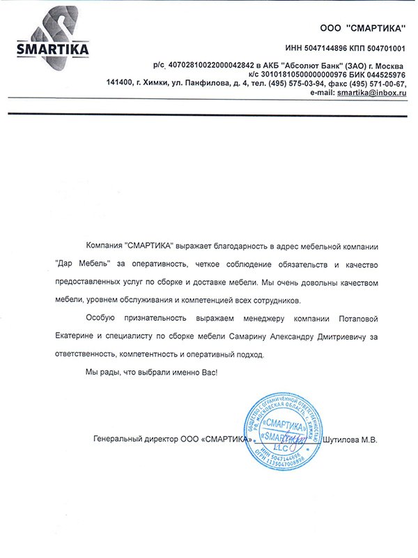 Компания "СМАРТИКА" выражает благодарность в адрес мебельной компании "ДАР МЕБЕЛЬ" за оперативность, четкое соблюдение обязательств и качество предоставляемых услуг по сборке и доставке мебели. Мы очень довольны качеством мебели, уровнем обслуживания и компетенцией всех сотрудников. Особу признательность выражаем менеджеру компании Потаповой Екатерине и специалисту по сборке мебели Самарину Александру Дмитриевичу за ответственность,компетентность и оперативный подход. Мы рады, что выбрали именно Вас!