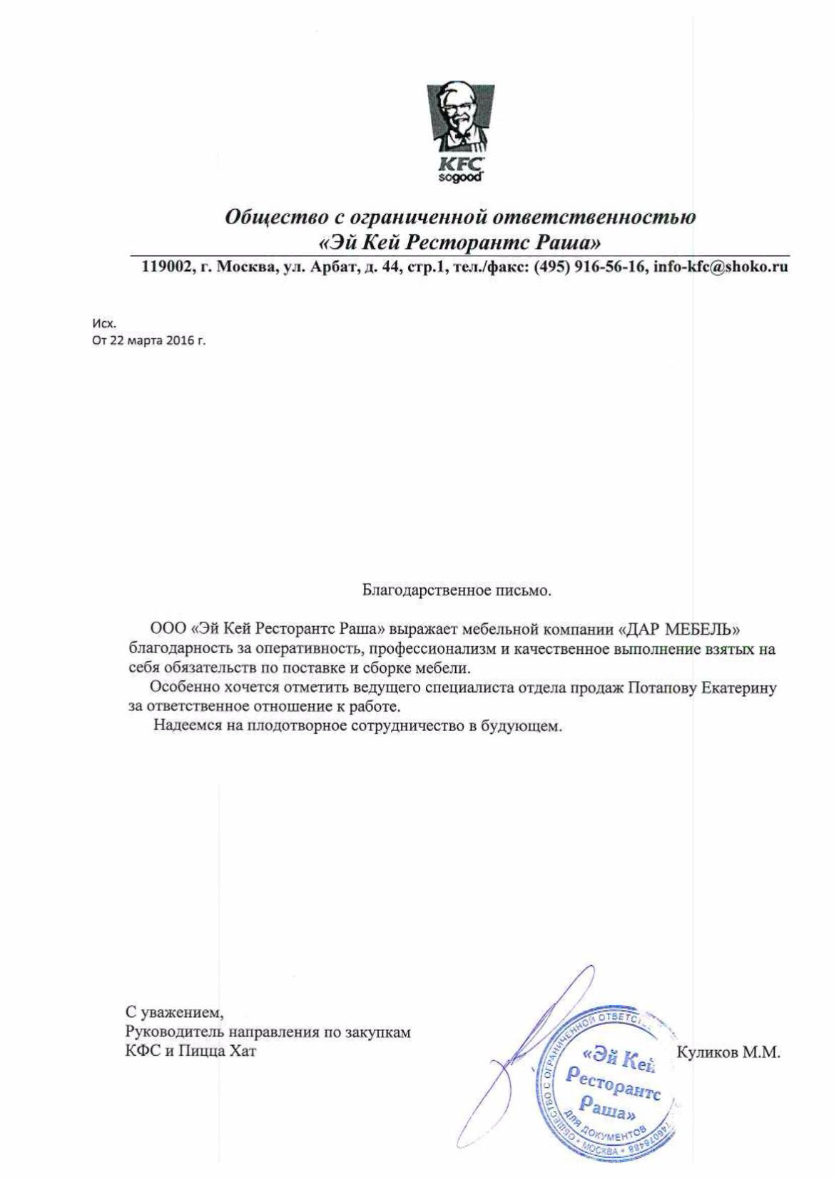 ООО «Эй Кей Ресторантс Раша» выражает мебельной компании «ДАР-МЕБЕЛЬ» благодарность за оперативность, профессионализм и качественное выполнеиие взятых на себя обязательств по поставке и сборке мебели. Особенно хочется отметить ведущего специалиста отдела продаж Потапову Екатерину за ответственное отношение к работе. Надеемся на плодотворное сотрудничество в будущем.