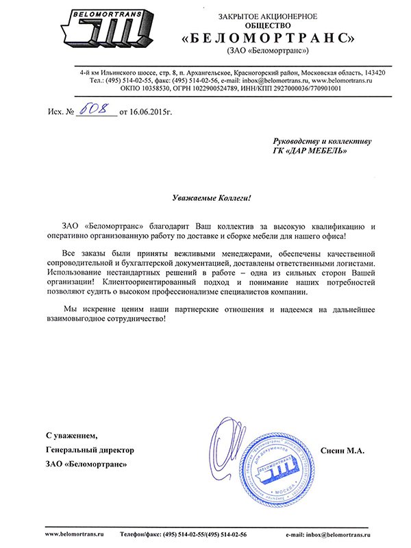 Уважаемые Коллеги! ЗАО "Беломортранс" благодарит Ваш коллектив за высокую квалификацию и оперативно организованную работу по доставке и сборке мебели для нашего офиса! Все заказы были приняты вежливыми менеджерами, обеспечены качественной сопроводительной и бухгалтерской документацией, доставлены ответственными логистами. Использование нестандартных решений в работе - одна из сильных сторон Вашей организации! Клиентоориентированный подход и понимание наших потребностей позволяют судить о высоком профессионализме специалистов компании. Мы искренне ценим наши партнерские отношения и надеемся на дальнейшее взаимовыгодное сотрудничество!