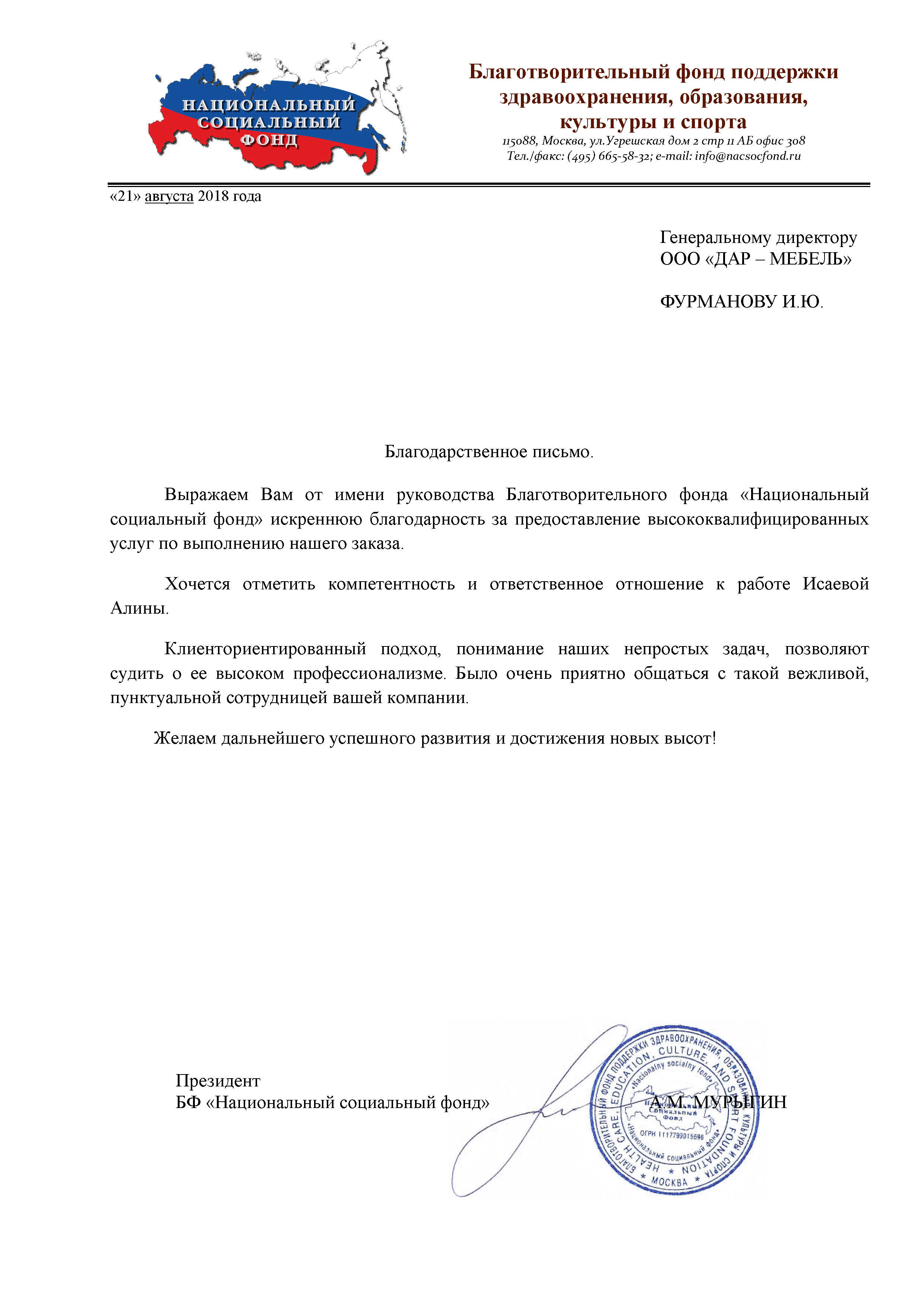 Выражаем Вам от имени руководства Благотворительного фонда «Национальный социальный фонд» искреннюю благодарность за предоставление высококвалифицированных услуг по выполнению нашего заказа. Хочется отметить компетентность и ответственное отношение к работе Исаевой Алины. Клиенториентированный подход, понимание наших непростых задач, позволяют судить о ее высоком профессионализме. Было очень приятно общаться с такой вежливой, пунктуальной сотрудницей вашей компании. Желаем дальнейшего успешного развития и достижения новых высот!